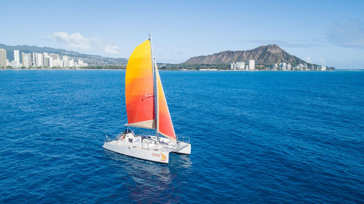 青い海を爽快にセーリング!レース用にデザインされたホロカイ・カタマラン号でワイキキ沖を目指します。太陽がさんさんと照りつける中、ダイヤモンドヘッドやワイキキビーチなどを眺め、運が良ければウミガメやイルカの群れに出会うことも!